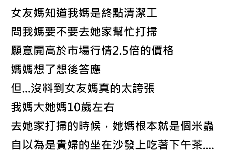 情侶交往的問題不僅出自兩人之間,有時還會牽扯到家人 一名男子便透露,母親是鐘點清潔工,