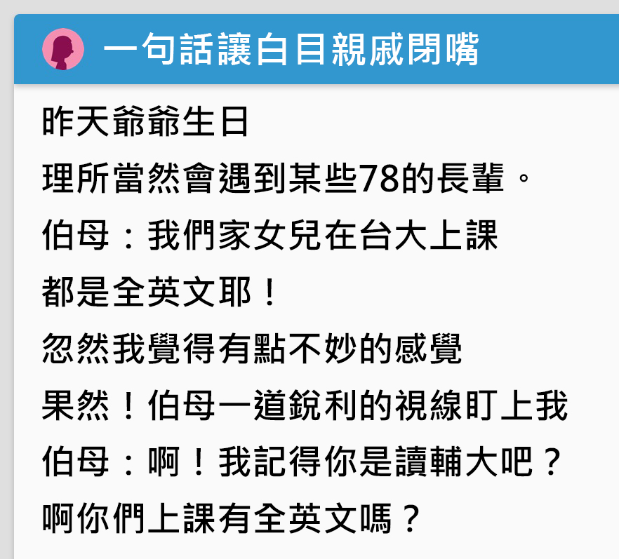 每當家族聚會,最怕的就是長輩親戚之間互相比較,一名女網友分享,日前家族替爺爺慶生,席間一位伯母開始炫