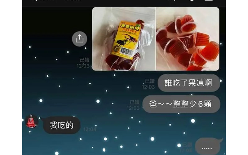 女網友因飼養甲蟲,在家中擺放昆蟲食用的樹液果凍,沒想到回頭一看發現突然少了6顆,一問之下才知道是被爸