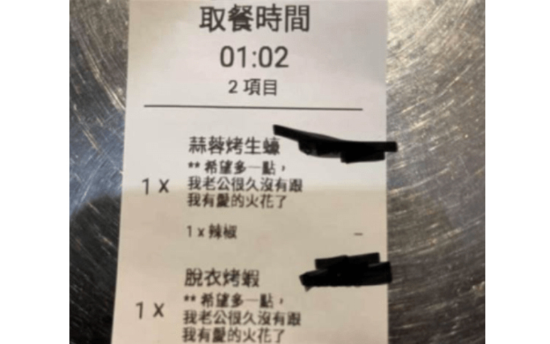 一名人妻為了和老公有更多親密接觸,在外送平台點了生蠔、鮮蝦料理,並在訂單上抱怨「我老公很久沒有跟我有