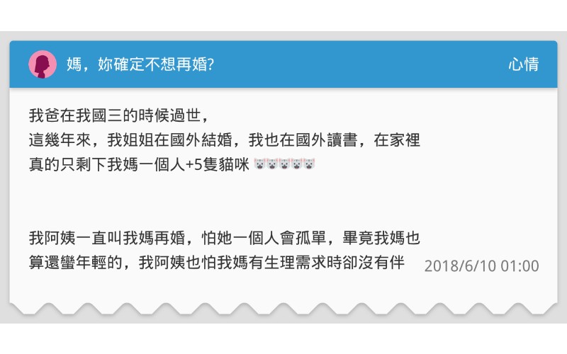 真的需要另一伴嗎?一名女網友PO文,表示爸爸多年前去世,擔心媽媽一個人孤單寂寞,不斷催促她再婚,沒想