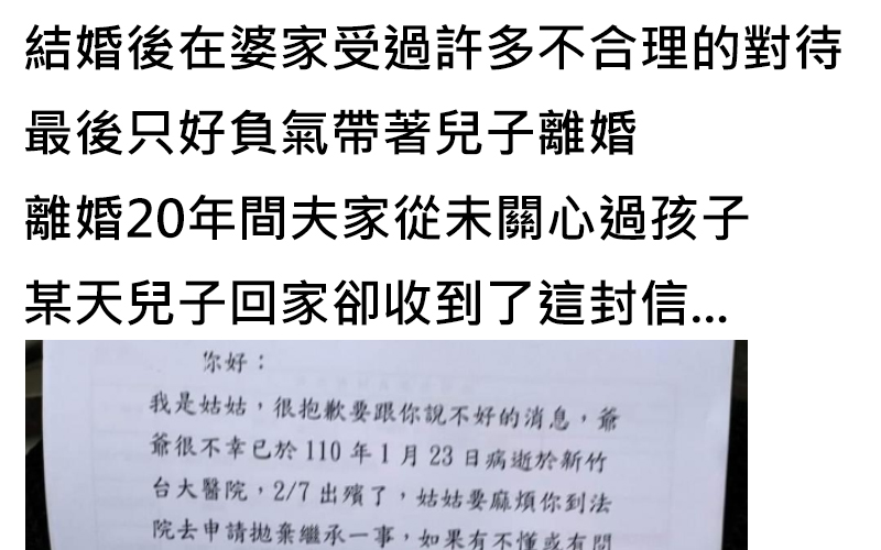 離婚20年,前夫家對孩子不聞不問,卻收到掛號信…竟是要孩子「拋棄財產的繼承權」!! 日前