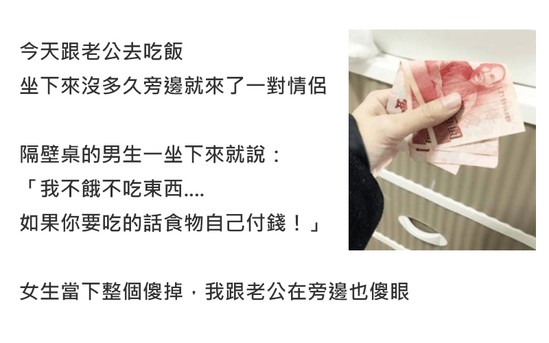 網友在臉書社團上發文 –以下為真實遇到情況 今天跟老公去吃飯,坐下來沒多久旁邊就來了一對
