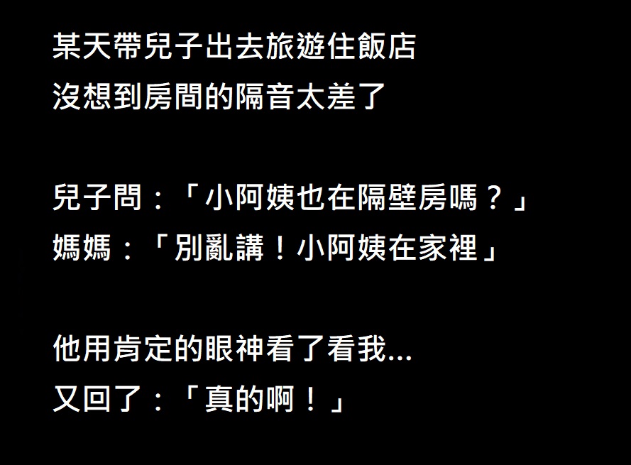 旅遊住飯店,半夜時兒子卻意外說出驚人的真相… 一次帶兒子出去旅遊,賓館的隔音太差了,傳來了隔壁的叫聲