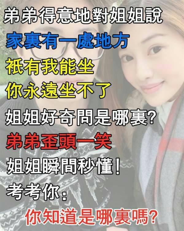 弟弟能坐,姐姐永遠坐不了! 是哪裡? . . . . 答案 姐姐自己的腿 加入我們的L
