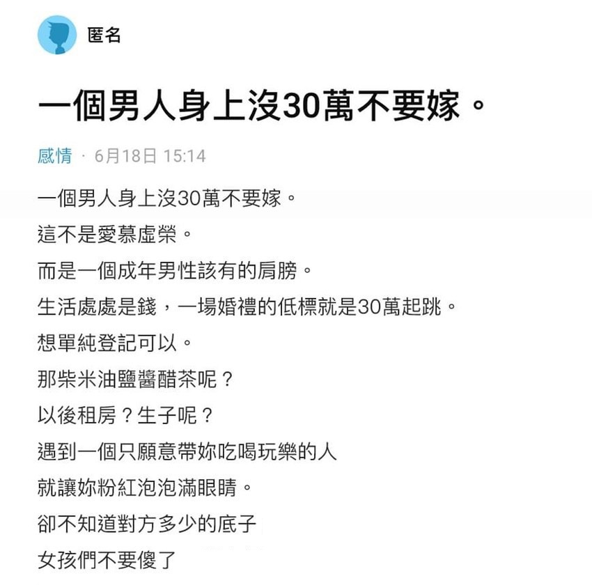連30萬都沒有的男人不要嫁。 加入我們的Line群 「爆笑大集合」,每天分享好多趣味梗! 👉 ht