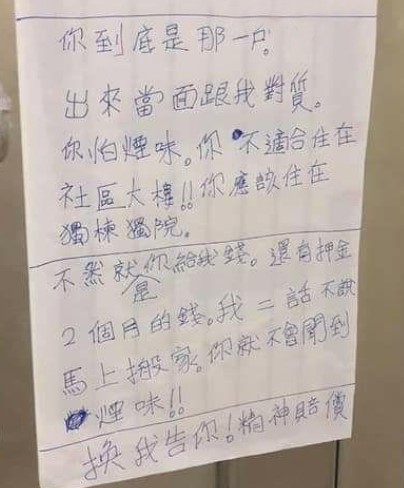 大樓住戶抽菸被投訴,居然在電梯內留「囂張紙條嗆聲」太猖狂 網友在臉書社團上分享一張在電