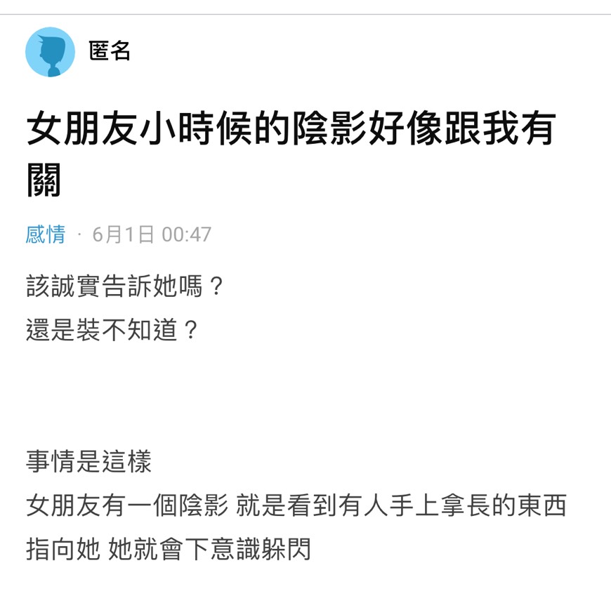 女友小時候的陰影跟我有關…該誠實告訴她嗎? 全文如下 加入我們的Line群 「星座日報」,看更多星座