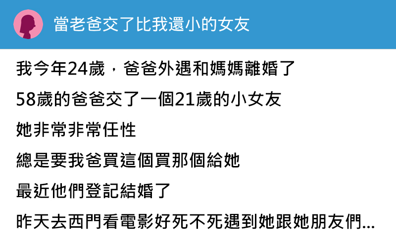 老爸和比我小的女人結婚了,某天在電影院門口看到二媽…我一句話讓他尷尬了!
