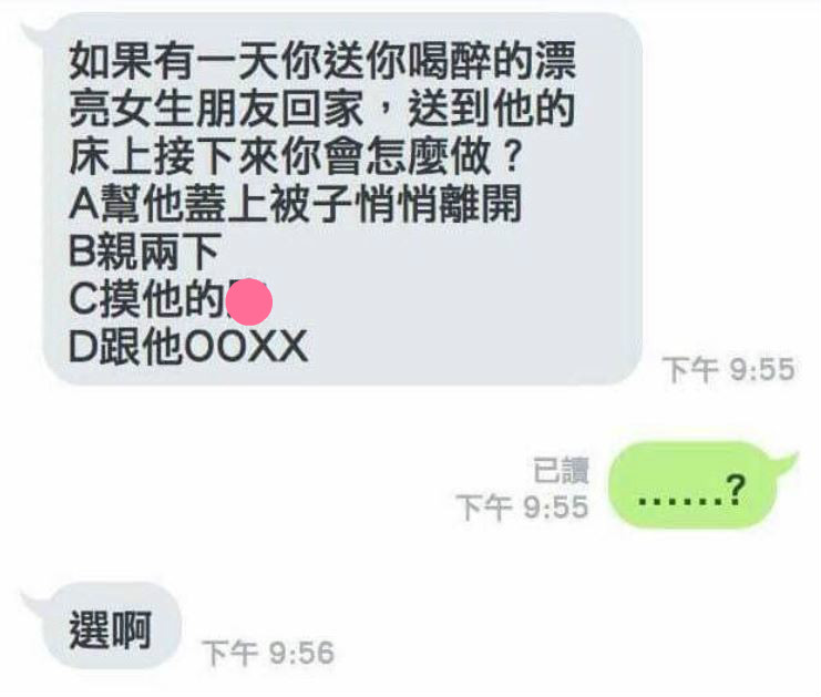 日前有網友在《Dcard》分享了一段對話,「如果有一天你送你喝醉的漂亮女生朋友回家,送到他的床上,接
