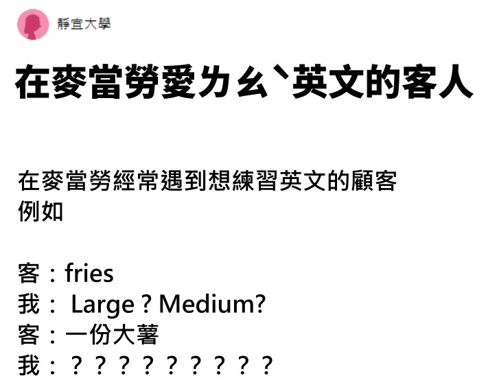 在麥當勞經常遇到想練習英文的顧客 例如 客:fries 我: Large ? Medi