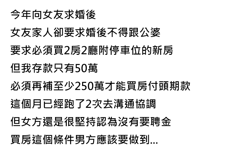 一名男子抱怨: 今年初向女友求婚後,女方堅持女兒不得跟公婆住,要求男方必須買2房2廳附停車位的新房,