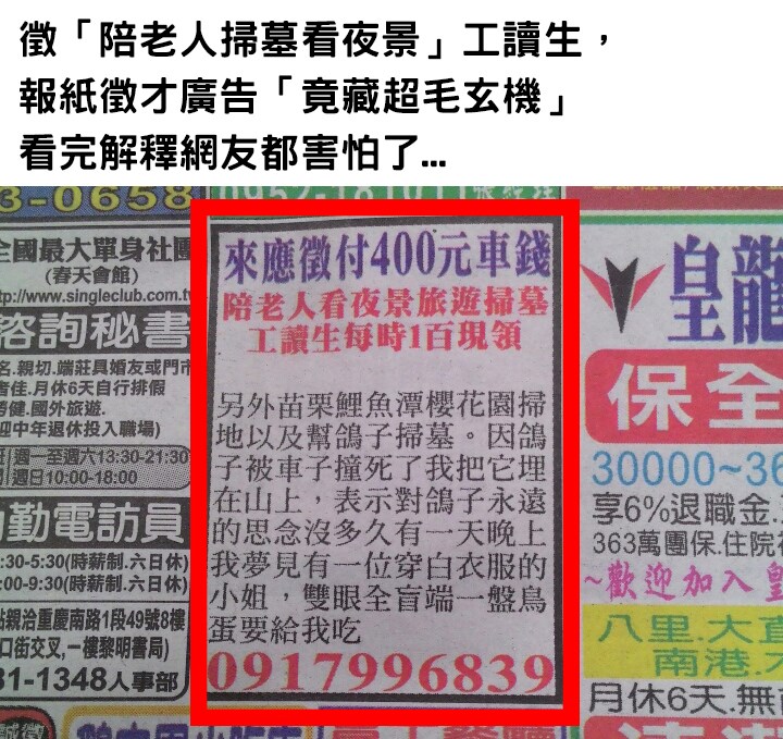 雖然說現在找工作大多直接用網路了,不少人還是選擇用報紙徵才。 有網友在批踢踢分享一張2