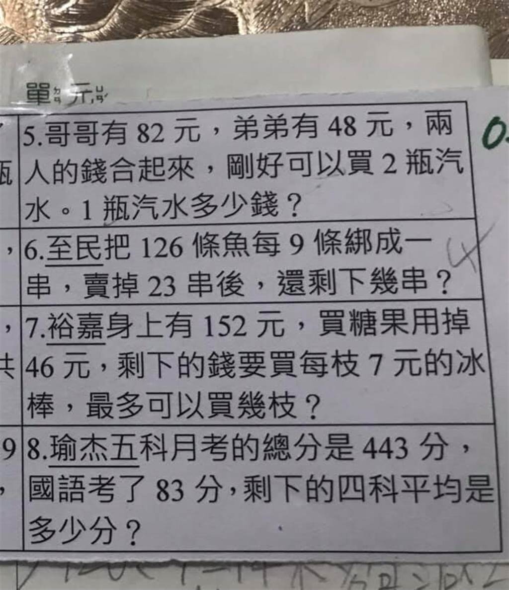 國小三年級的數學解不開! 一名爸爸發文求助網友,兒子數學作業的第六題寫道「126條魚每9條綁成一串,