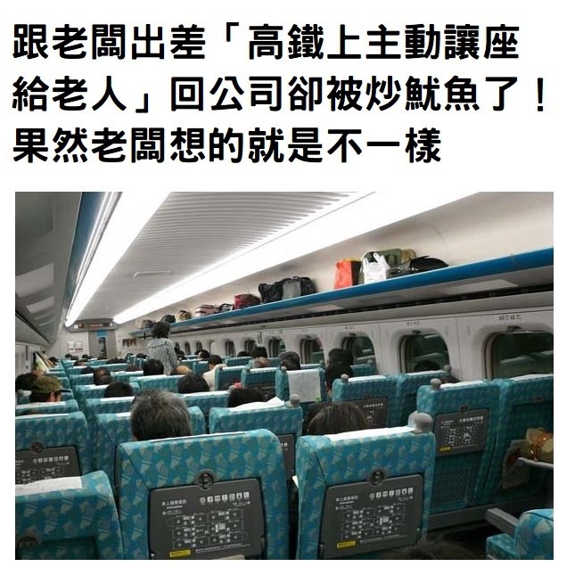 女員工跟老闆出差,高鐵上主動「給老人讓座」,隔天回到公司卻被老闆親自告知:你被辭退了 在職場上,一個
