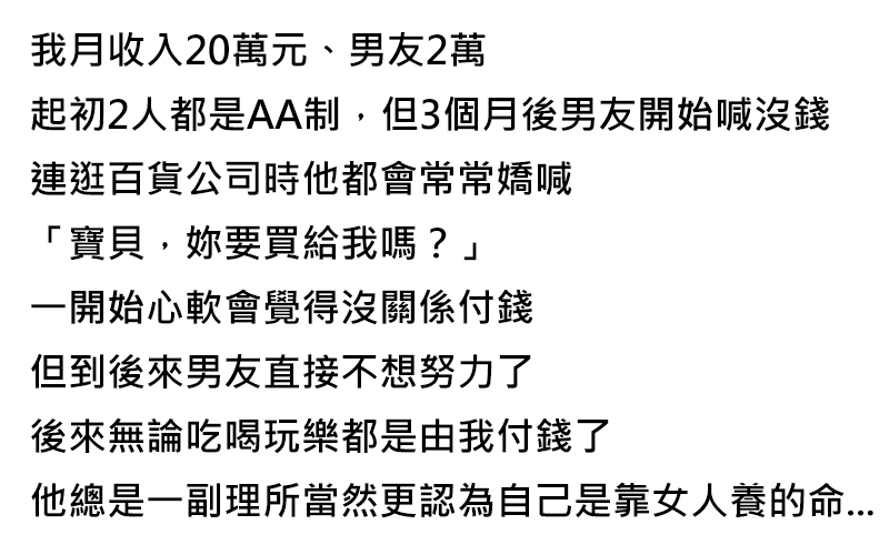 一名女網友發文求助,稱她月入20萬元、男友月入2萬,起初2人都是AA制 但3個月後男友開始喊沒錢,到