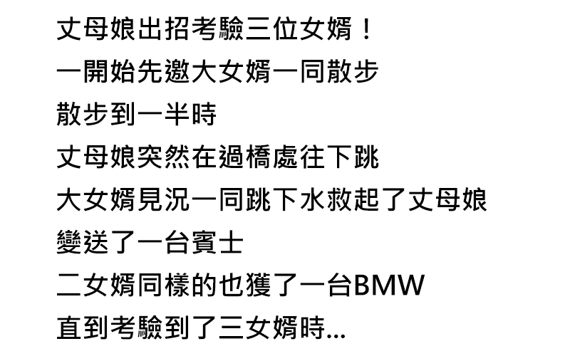 丈母娘出招考驗三位女婿! (網路示意圖) 一開始先邀大女婿一同散步 散步到一半時 丈母娘突然在過橋時