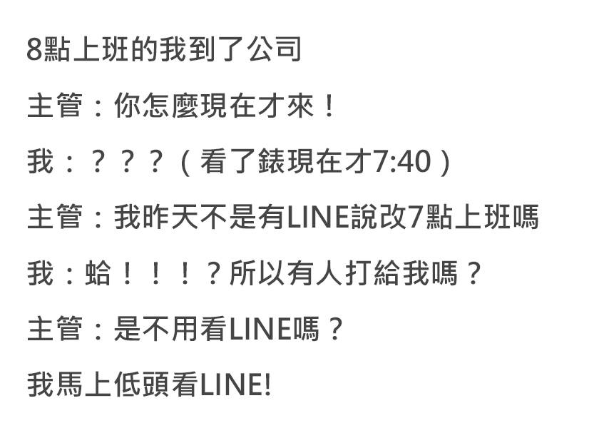 8點上班的我到了公司 主管:你怎麼現在才來! 我:???(看了錶現在才7:40) 主管:我昨天不是有