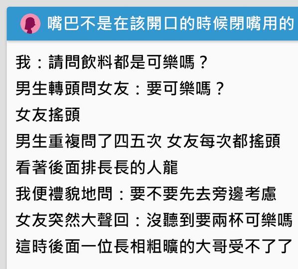網友在DcardPO文,在速食店打工時一對情侶來點餐,過程中男友問女友要不要喝飲料女友一直搖頭,之後