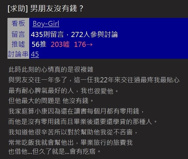 愛情與麵包,哪一個更重要? 有女生在批踢踢實業坊Boy-Girl男女板發文問掛,她指出自己男友什麼都