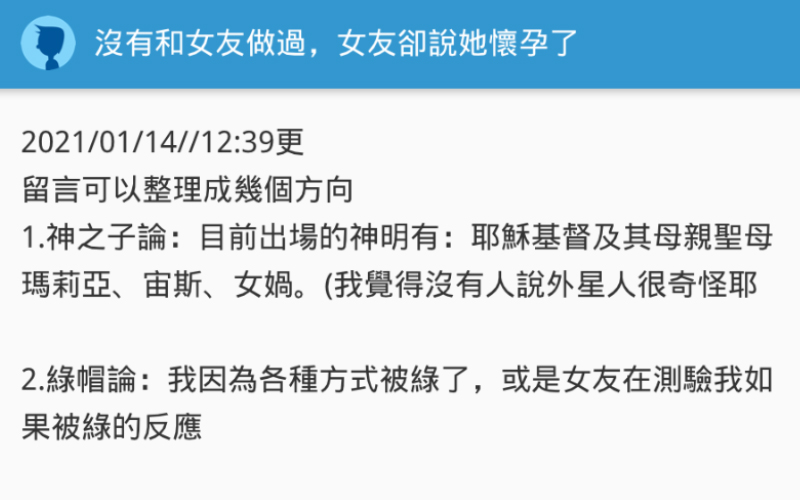 網友在DCARD上發文問【沒有和女友做過,女友卻說她懷孕了】到底是怎樣??? (圖/DCARD截圖)