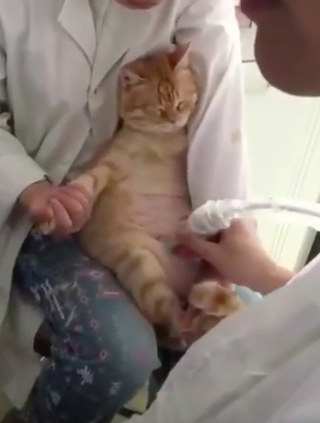 網友流傳一支影片,一隻可愛的橘貓乖乖坐在護士身上,當醫生在牠身上照超音波時完全沒有反抗,乖乖地露著肚