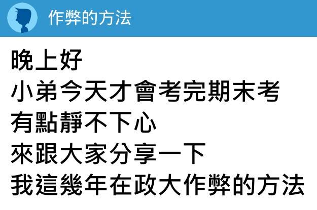 在迎接假期前,學生都得好好準備期末考,但考試往往讓學子一個頭兩個大。一名政大男大生就曝光自己作弊的方