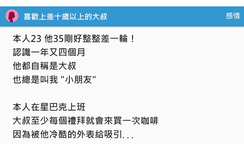 一名網友在迪卡上發文敘述最近讓自己困惑了感情…不知不覺喜歡上了一個比自己大