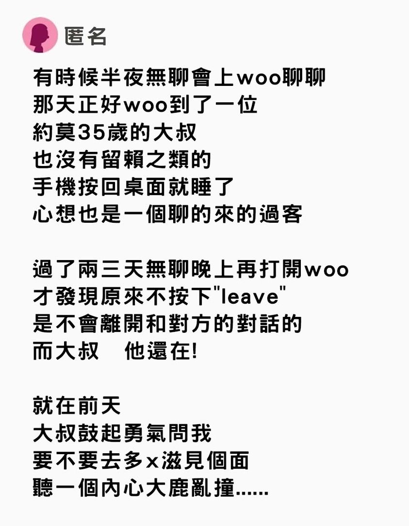 有網友在dcard上分享在wootalk認識了一位大叔,沒想到相約見面時,對方竟然是…