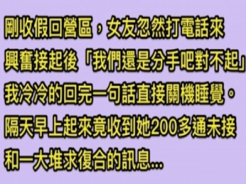 1 剛收假回營區,女友忽然打電話來興奮接起後:「我喜歡上別人了,我們還是分手吧,對不起