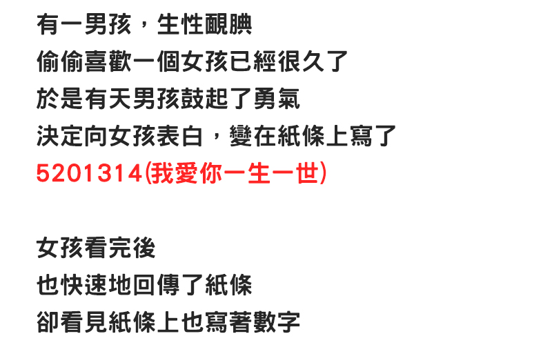有一男孩,生性靦腆 偷偷喜歡一個女孩已經很久了 於是有天男孩鼓起了勇氣 決定向女孩表白,變在紙條上寫