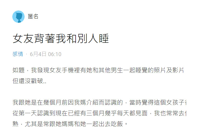 如題,我發現女友手機裡有一些奇怪的照片及影片,現在看完整個難以置信,但還沒戳破.. 我跟她是在幾個月