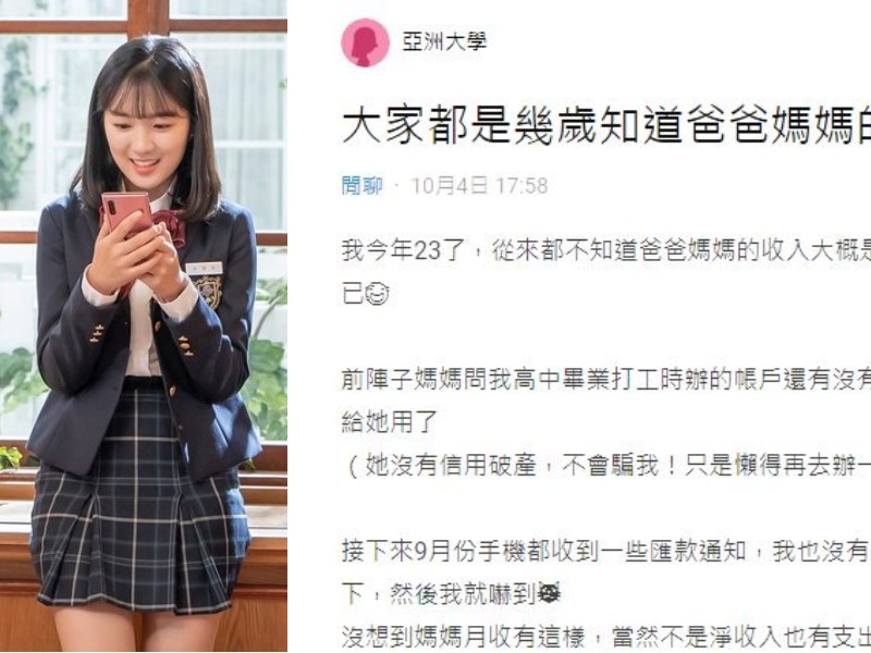 爸媽辛苦養家,但許多人其實並不知道家長實際收入是多少。一名23歲女網友發文表示,日前意外得知了媽媽的