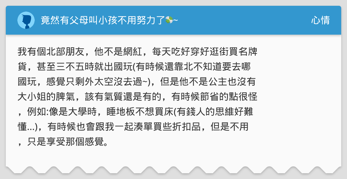 許多人夢想成為「有錢人」,希望可以過著無憂無慮的生活。一名網友他有位女性朋友,父母竟叫她「不用努力了