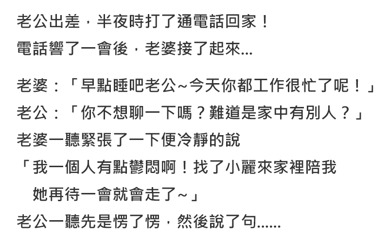 老公出差,半夜時打了通電話回家! 電話響了一會兒後,老婆接了起來… 老婆: