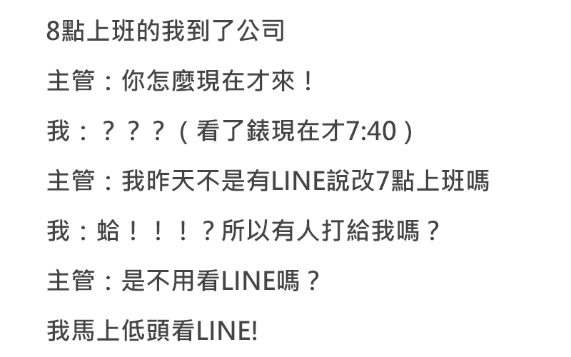 8點上班的我到了公司 主管:你怎麼現在才來! 我:???(看了錶現在才7:40) 主管