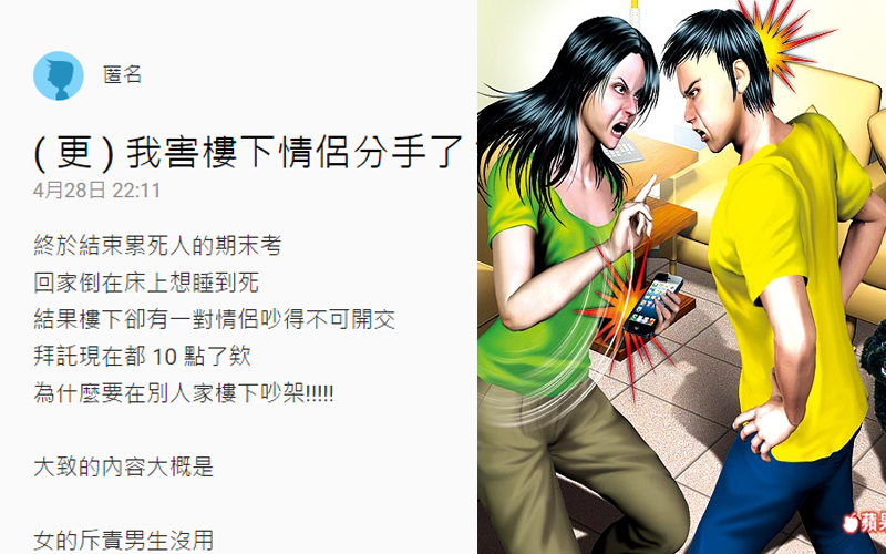 終於結束累死人的期末考 回家倒在床上想睡到死 結果樓下卻有一對情侶吵得不可開交 拜託現在都 10 點