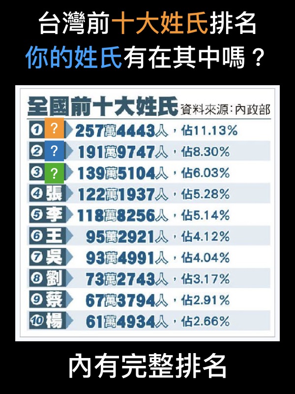 . . . 除宜蘭縣及雲林縣第一大姓為林姓外,其餘縣市皆以陳姓為第一大姓。 前十: 陳(11.06%