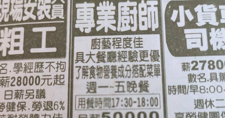 看完只能說好工作難尋! 一名網友在臉書發文,他說自己在徵才資訊上看到一則雇用專業廚師的