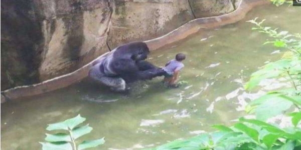 在參觀猩猩的時候,孩子不慎失足從假山滑進了“猩猩樂園”裡面有一隻站立時身高1米5的強壯猩猩,在這位鋼