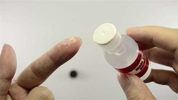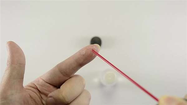 2、成功掰開的手指部位,你可以看到快乾膠殘留在皮膚上頭的白色硬掉的透明片,為了除去這些礙眼的透明片,你可以使用指甲的去光水(丙酮)擦拭即可