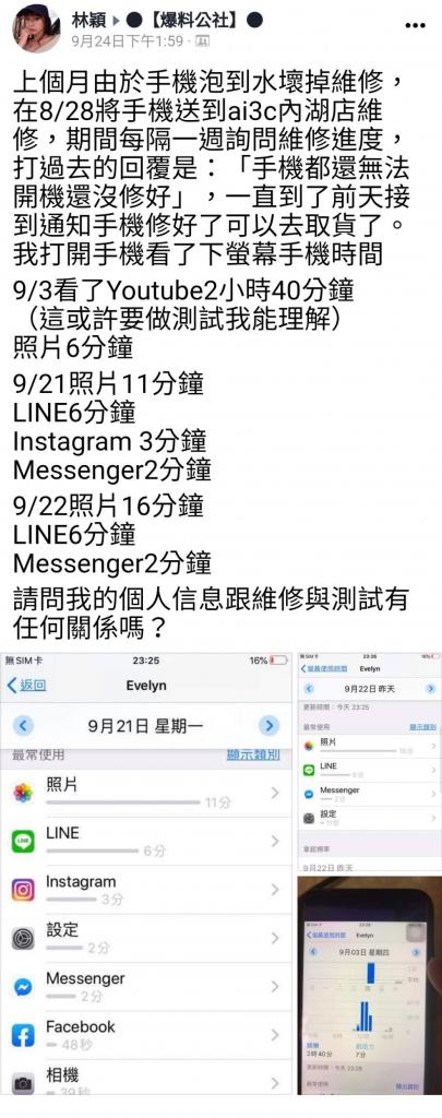 一名女網友將手機送修,卻發現自己隱私被看光光,氣得她將此事PO上臉書社團。