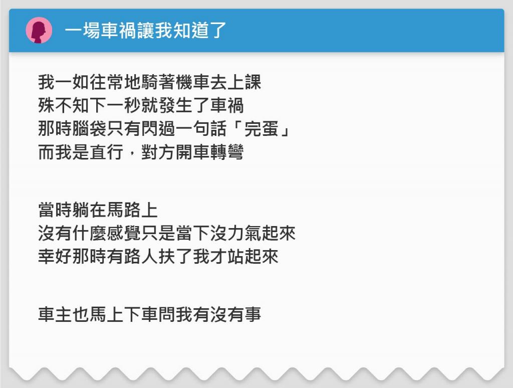 話說那一天,騎著機車出門的她被一輛車撞倒了,當時身上被外套、防曬裙和口罩覆蓋著的她看起來沒什麼大礙,然而在她脫下逐漸被鮮血染紅的口罩時,路人和撞倒她的車主都露出了一臉驚恐的模樣。