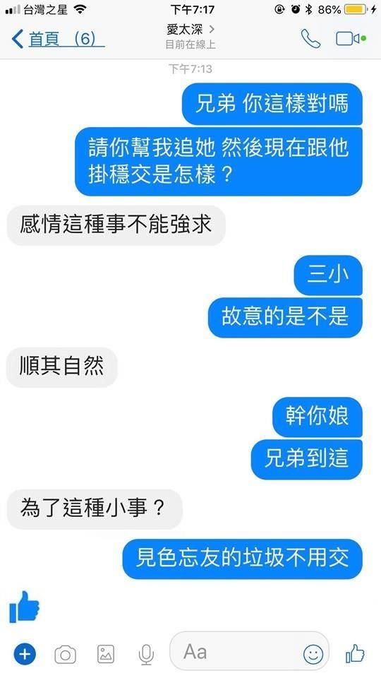 氣得他傳訊痛罵「兄弟你這樣對嗎」、「故意的是不是」,朋友雖然想解釋,「感情這種事不能強求」,但網友仍聽不進去,還說:「兄弟做到這」。