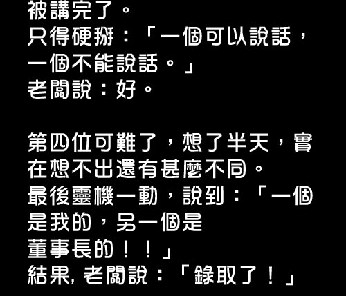 說完後,面試官立馬站起來為她鼓掌,而旁邊的兩位男生,卻只是傻傻的坐在一旁,或許還在想她說的這兩個字呢,最張,同學也被這家公司錄用了