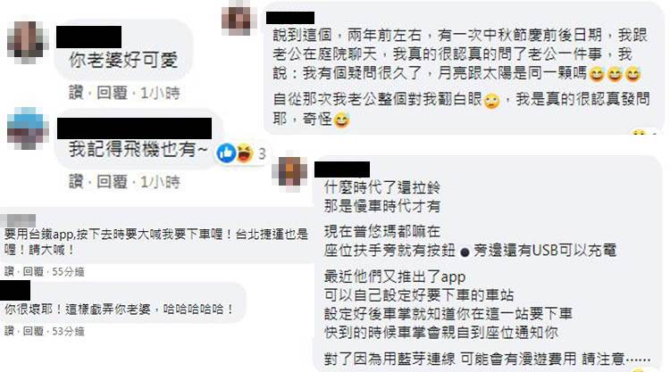 網友們看完之後也笑翻「你老婆好可愛。」、「你老婆太可愛了。」不過也有人幫老婆平反「你老婆人真好,明知道火車沒有下車鈴,可是為了你的自尊心還特意搭著你的話題聊下去,其實她內心的OS應該是:竟然有人長這麼大了,還不知道火車沒下車鈴的。」、「結果老婆之後又貼一篇:老公居然覺得火車有下車鈴,只好附和他。」