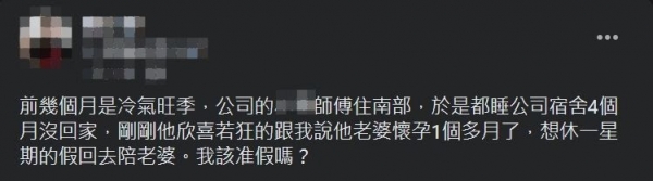 不過他就坦言,沒想到剛剛那名師傅開心地跑來和他說「老婆懷孕1個多月了」,更希望能請假休息一個星期,回去陪伴老婆。原PO一聽到不合理的懷孕時間,就讓原PO焦慮直呼「我該准假嗎?」