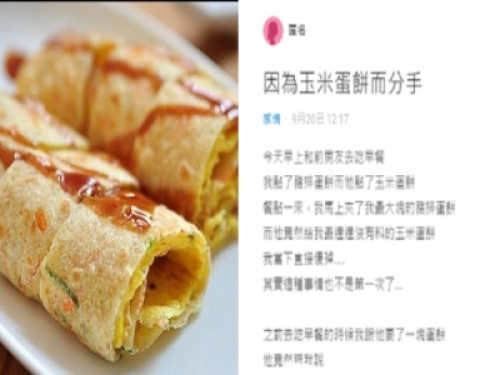 女網友於20日在「Dcard」上抱怨,提到當天上午與男友相約吃早餐,自己點了豬排蛋餅,對方則是點了玉米蛋餅,通常兩人會交換吃,餐點一到,她立刻夾了「最大塊」的給男友