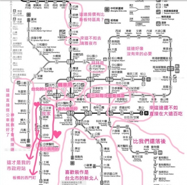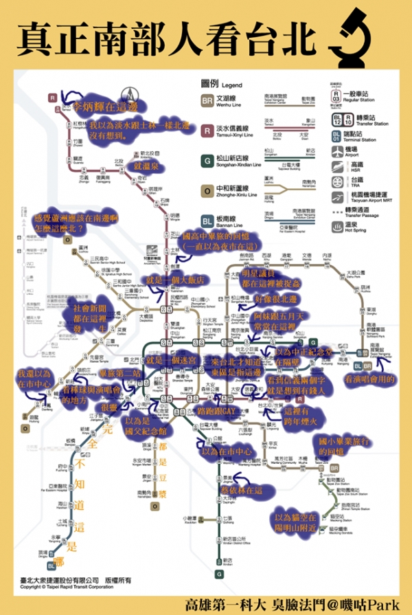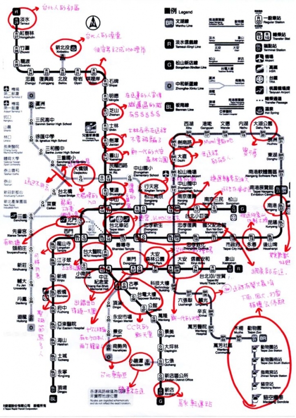 在論壇《嘰咕 Park 》PO出一張自己對台北捷運每一站的註解圖,