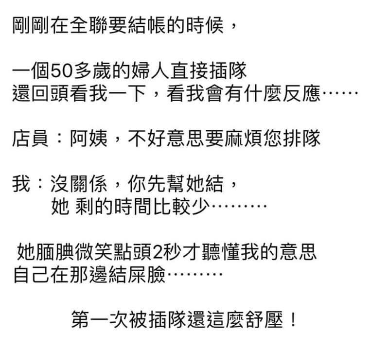 我(用大聲到讓所有顧客都聽見的音量):「所以你就可以因為自己年紀大就插隊嗎!當別人不是顧客啊?妳趕時間我就不趕時間啊?現在的長輩怎麼都這麼不禮貌啊!」